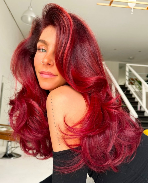 Dieser lebendige kirschrote Farbton verleiht welligem, langem Haar Tiefe und Reichtum, perfekt für diejenigen, die einen mutigen, aber eleganten Look wünschen. Das glänzende Finish verbessert die dimensionalen Locken und macht es zu einem Show-Stopper für formelle oder ungezwungene Anlässe. Dieser Farbton ist ideal für ovale und herzförmige Gesichter und kann mit Schwarzkopf Live Color in „Real Red“ oder L’Oréal Feria in „Cherry Crush“ erreicht werden. Kombinieren Sie ein feuchtigkeitsspendendes Shampoo, um die Lebendigkeit aufrechtzuerhalten. @JerryDoeshair.