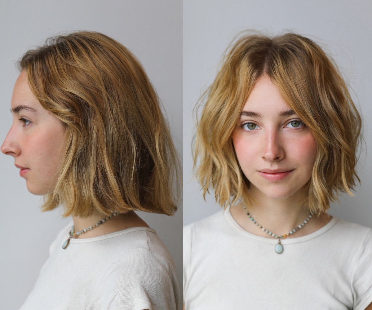 Der After -Look verfügt über leichte, luftige Wellen mit subtilen Vorhangschlägen, die das Gesicht wunderschön rahmen. Die beschädigten Ziele sind verschwunden, und was übrig bleibt, ist ein strukturierter, fahreracher Bob, der sowohl Bewegung als auch Persönlichkeit hinzufügt. Dieser Schnitt belebt nicht nur die Form des Haares – es verbessert das gesamte Look mit einer jugendlichen, mühelosen Atmosphäre.