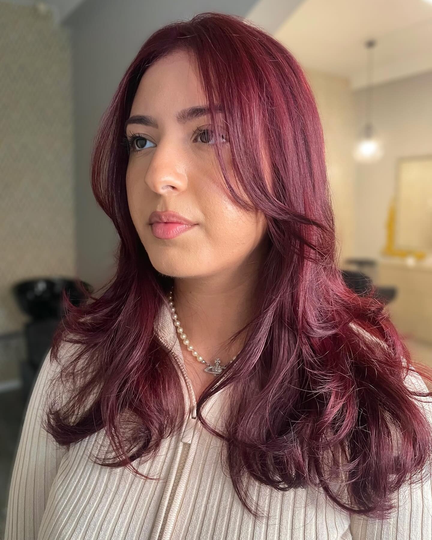 Eine polierte Cranberry -Farbe, gepaart mit langen Schichten und Vorhangstücken, verleiht dem Gesicht Weichheit. Dieser Stil bringt Eleganz und Körper und bietet sowohl Volumen als auch ein strahlendes rotes Finish.