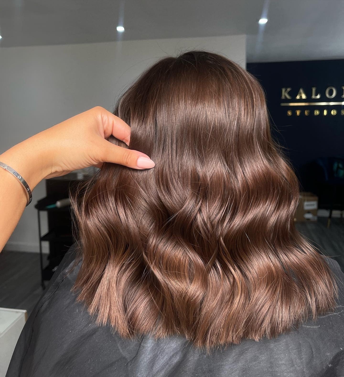 Ein raffinierter Kakaobon mit losen, glänzenden Wellen. Dieser Ansatz konzentriert sich auf Tiefe und Reichtum ohne übermäßigen Kontrast und erzeugt eine zeitlose und leicht zu machende Option.