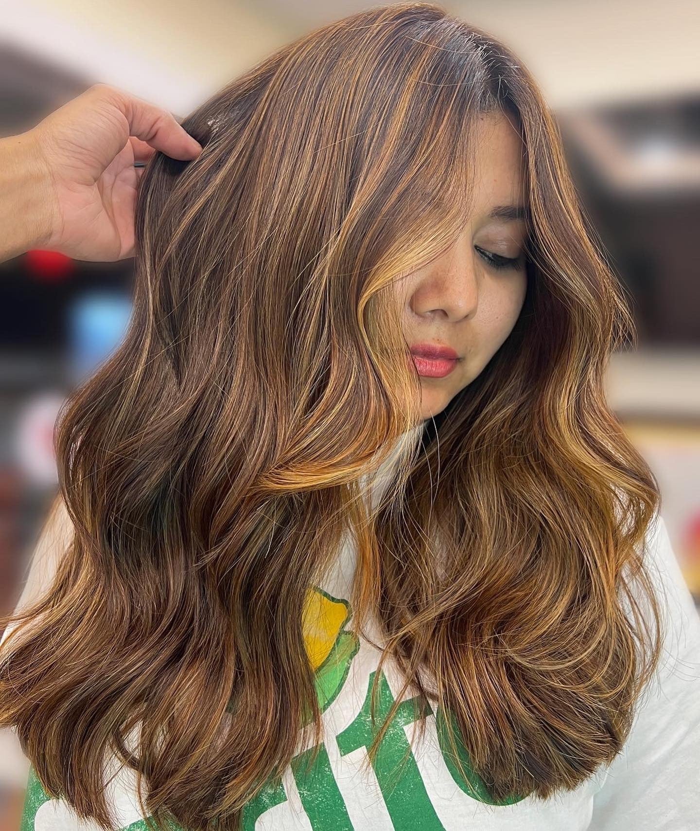 Lange, fließende Wellen werden geschichtet, um natürliche Bewegung und Volumen aufzubauen. Die golden Brown Foundation wird mit gerösteten Karamellbändern hervorgehoben, die die mittleren Länge und Enden aufhellen. Es ist ein ausgewogener Look, der Licht und Weichheit um das Gesicht bringt.