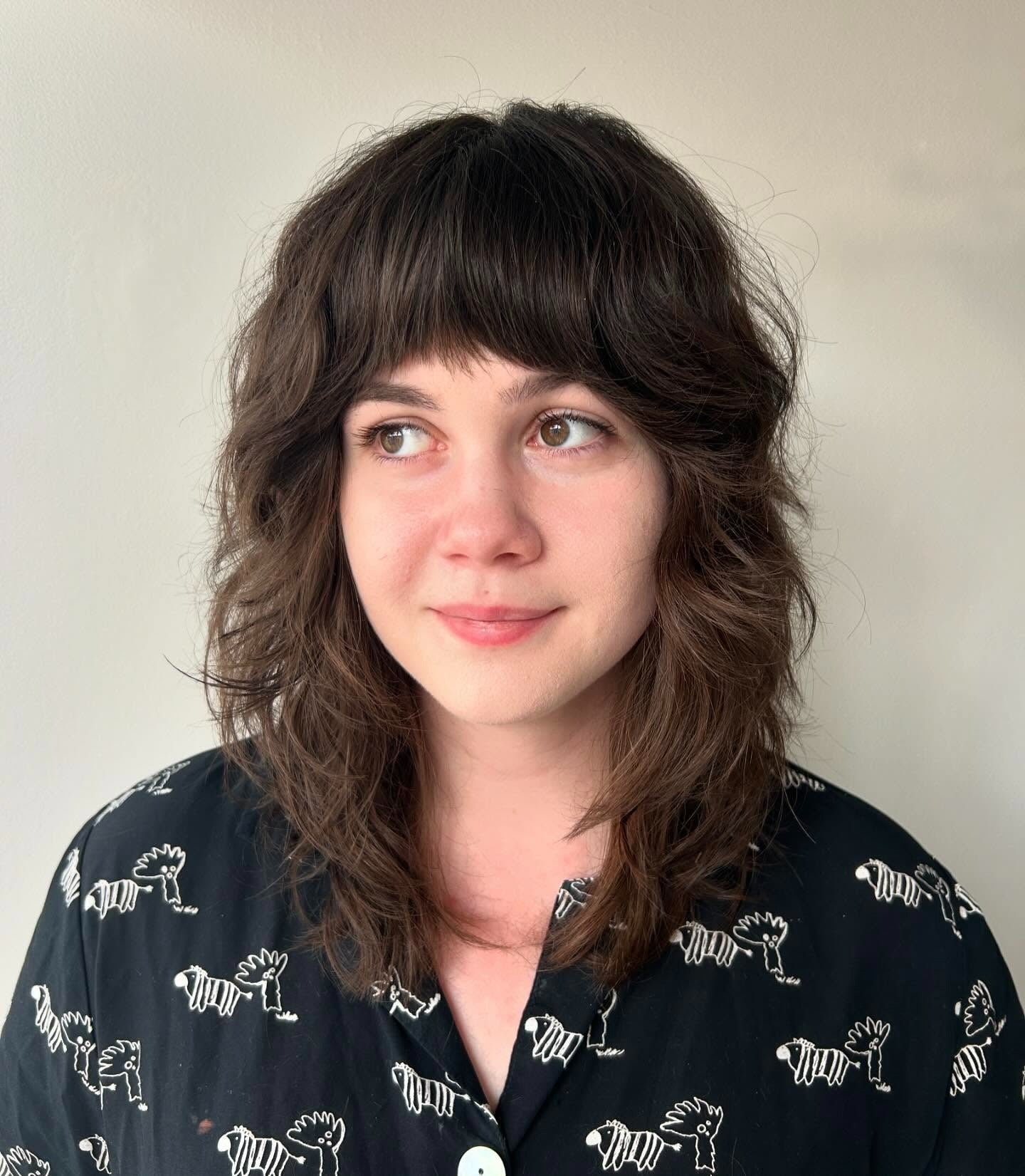 Lose Wellen und weiche Schichten definieren diesen mühelosen Shag. Der Vorhangrand verleiht dem Gesicht eine Form, während die Schichten um das Schlüsselbein natürliches Volumen und Weichheit erzeugen. Der natürliche braune Ton verbessert Glanz und Textur und macht diesen Schnitt zu einer lockeren, aber raffinierten Option.