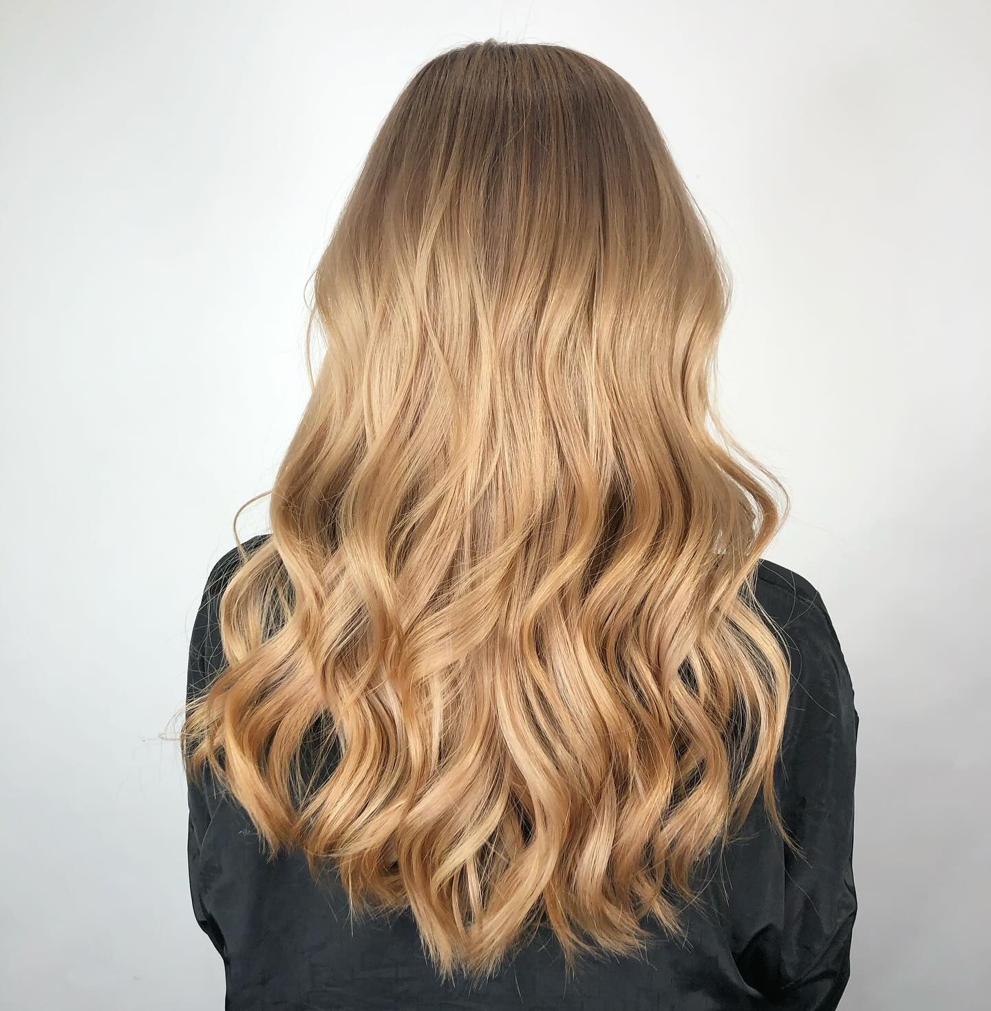 Lange, fließende Schichten, die zu lockeren Wellen geformt sind, zeigen einen warmen honigbraunen Farbton mit dezenter goldener Note. Das Finish sieht glatt, gesund und natürlich aus und macht diesen Look ideal für Kunden, die Bewegung wünschen, ohne auf Länge zu verzichten.