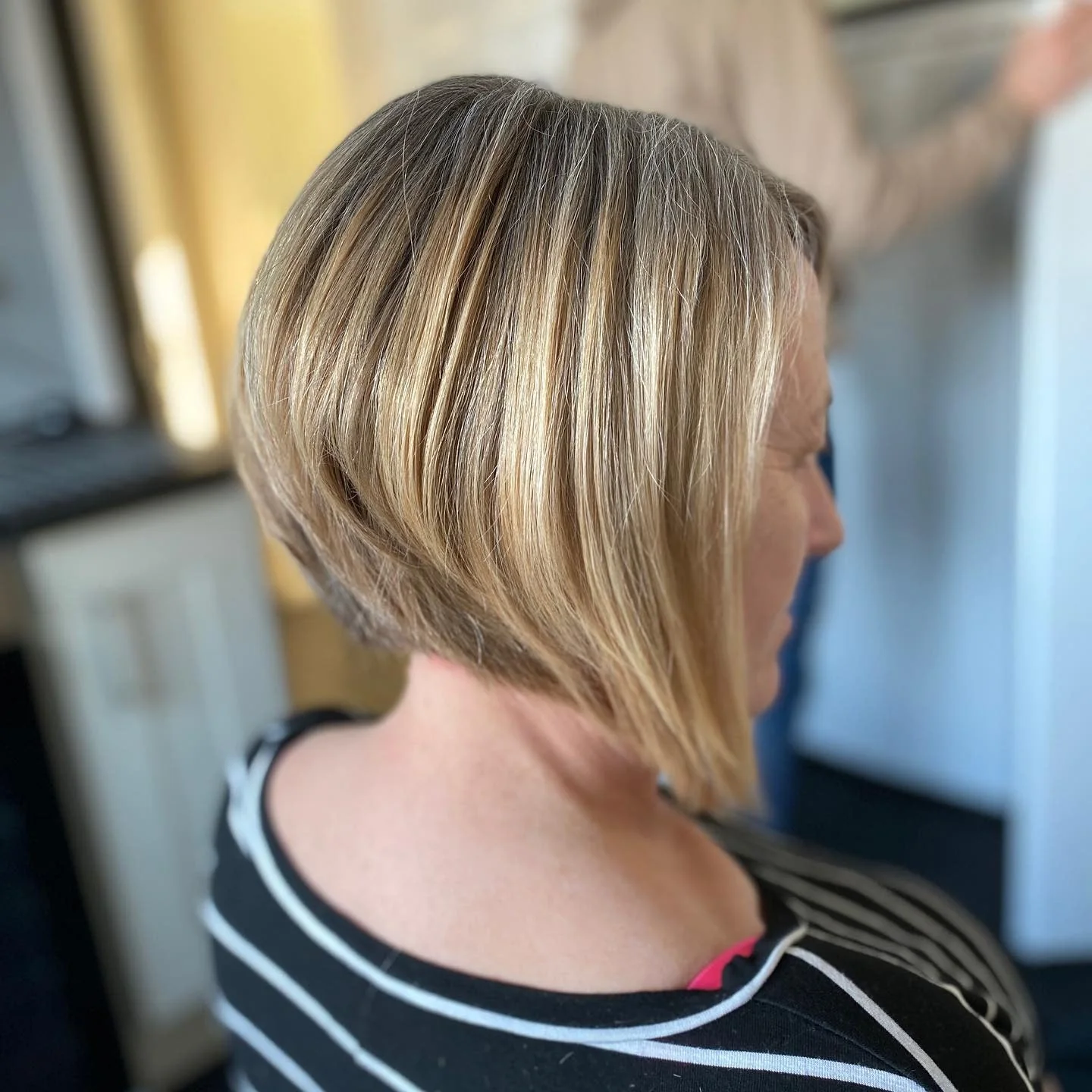 Ein sandblonder umgekehrter Bob mit sanften Wellen für zusätzliche Weichheit. Die längeren Vorderteile rahmen das Gesicht besser ein, während die strukturierte Rückseite eine saubere, moderne Kontur beibehält.