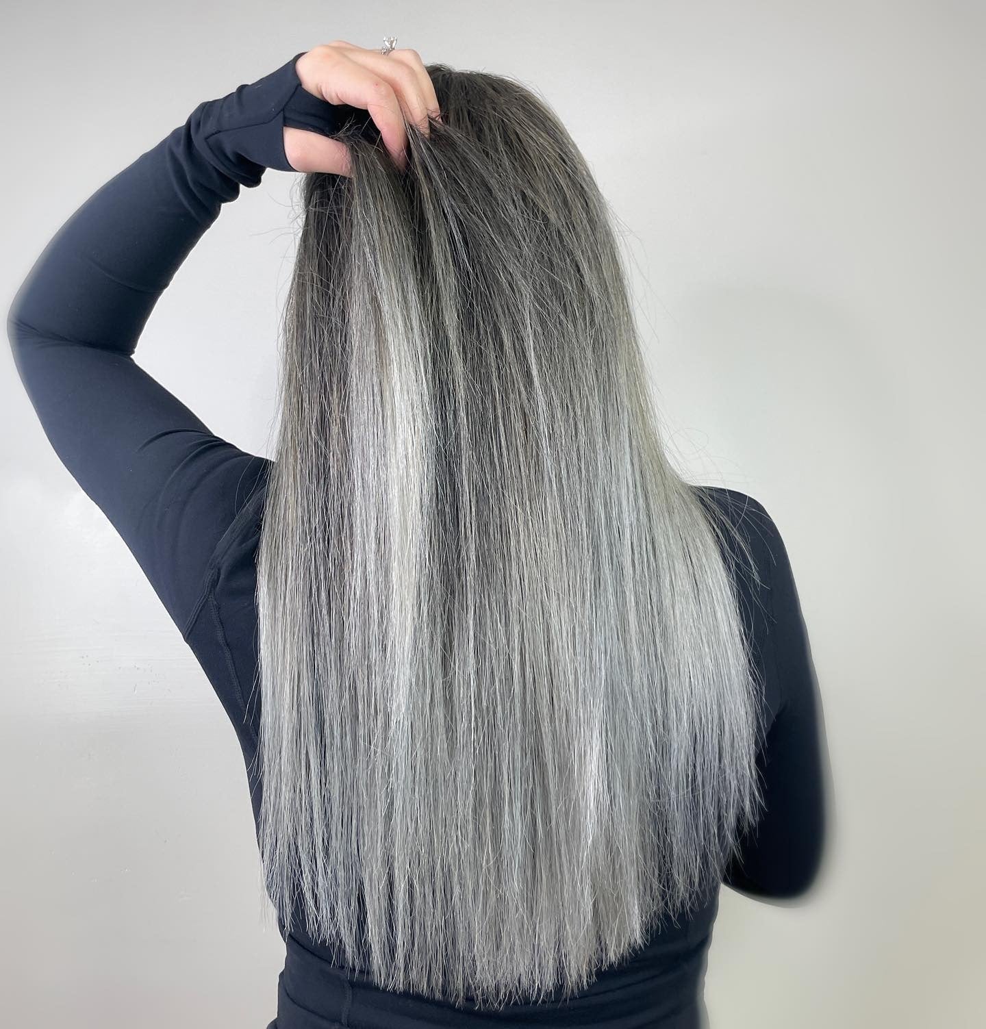 Lange, gerade Stränge mit einem glatten Übergang von natürlichen aschbraunen Wurzeln zu eisigen silbernen Enden. Der saubere Gradient fügt Kontrast hinzu und verlängert die Silhouette für ein modernes minimalistisches Finish.