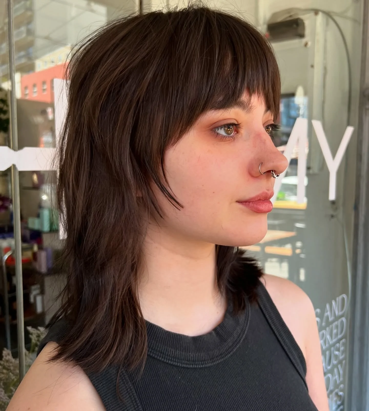 Tiefe Espressotöne verleihen diesem Shag Tiefe und Glanz. Der abgerundete Pony macht die Gesichtszüge weicher, während stückige Schichten in den mittleren Längen eine leichte, dynamische Silhouette schaffen, die sich ideal für mittlere Texturen eignet.