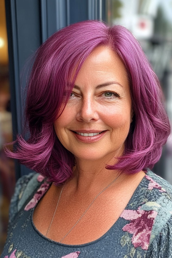 Dieser spielerische Bob ist eine fabelhafte Mischung aus Klassiker und Trend mit einem atemberaubenden Lavendel -Pop, der dem traditionellen Grau eine unterhaltsame Wendung verleiht. Die weichen, kinnlangen Schichten erzeugen einen wunderschön strukturierten Look mit viel Volumen und Bewegung. Der subtile Übergang vom natürlichen Grau zum lebendigen Lavendel an den Wurzeln verleiht diesem Stil einen zusätzlichen Hauch von Persönlichkeit, was es perfekt für Frauen über 60 macht, die ihre kühne Seite ausdrücken möchten und gleichzeitig ein schickes und raffiniertes Erscheinungsbild beibehalten.