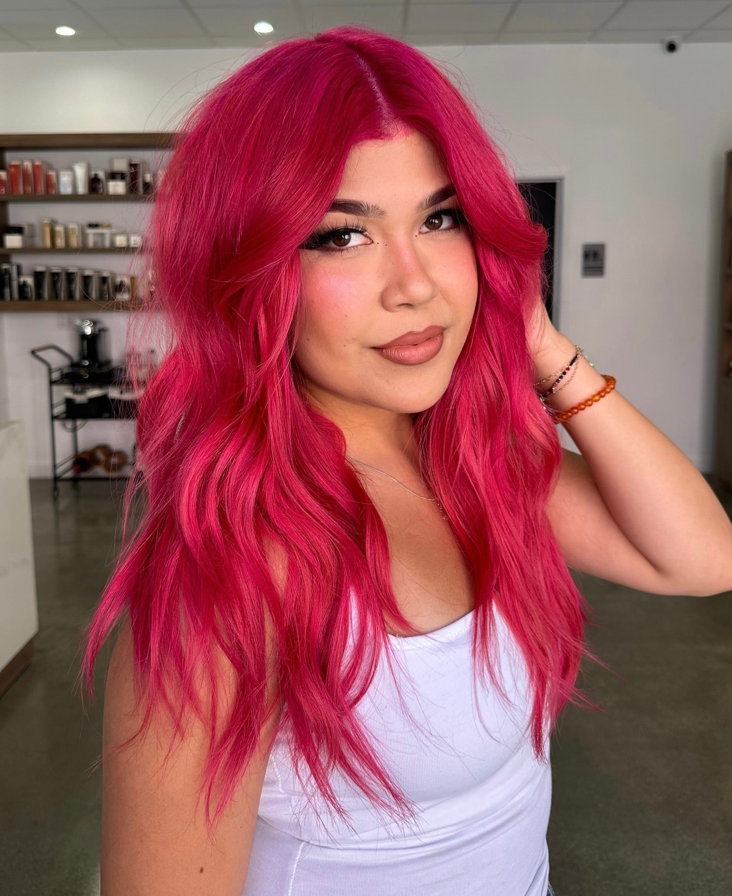 Lange Schichten und voluminöse Wellen werden mit einem mittleren Teil kombiniert, um das Gesicht perfekt zu rahmen. Die lebendige Fuchsie -Farbe wird von Wurzeln bis Enden angewendet, wodurch die Stilkonsistenz und Stärke verleiht. Dies ist ein mutiger, modischer Stil, der sich dank seines schmeichelhaften Schnitts immer noch tragbar anfühlt.