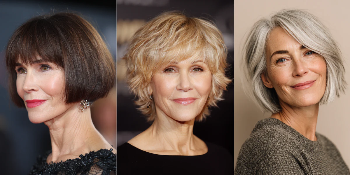 Ein kurzer Schnitt voller strukturierter Schichten und zarter Pony, perfekt für natürlich salziges Haar. Dieser Look verstärkt den Kontrast und die Dimension und verleiht den Gesichtszügen älterer Menschen Frische.