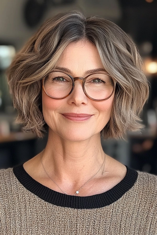 Schauen Sie sich diesen super süßen Bob mit weichen Wellen an, das perfekt zum Hinzufügen von Lautstärke und Textur ist. Der aschebraune Farbton ergänzt den warmen Hautton wunderschön, während die abgerundete Brille das Gesicht perfekt rahmen. Dieser Look ist mühelos schick und alterswichtig!