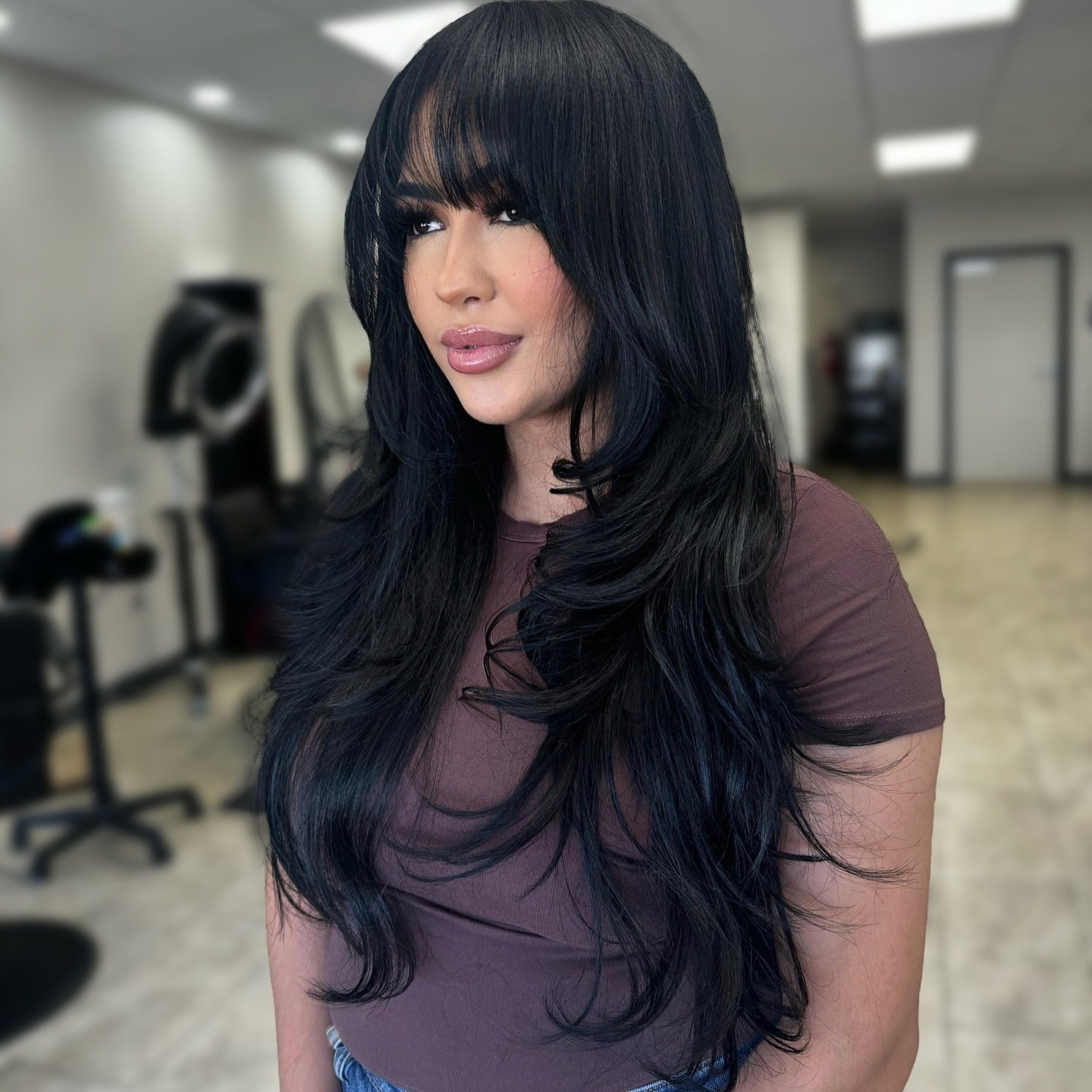 Tiefe blau-schwarze Stränge sind zu langen, weichen Schichten mit einem vollen Rand geformt, der die Augenbrauen weidet. Der Haarschnitt kombiniert Volumen und Struktur, ideal für dickes Haar, das von der Formen durch die Krone und Länge profitiert.