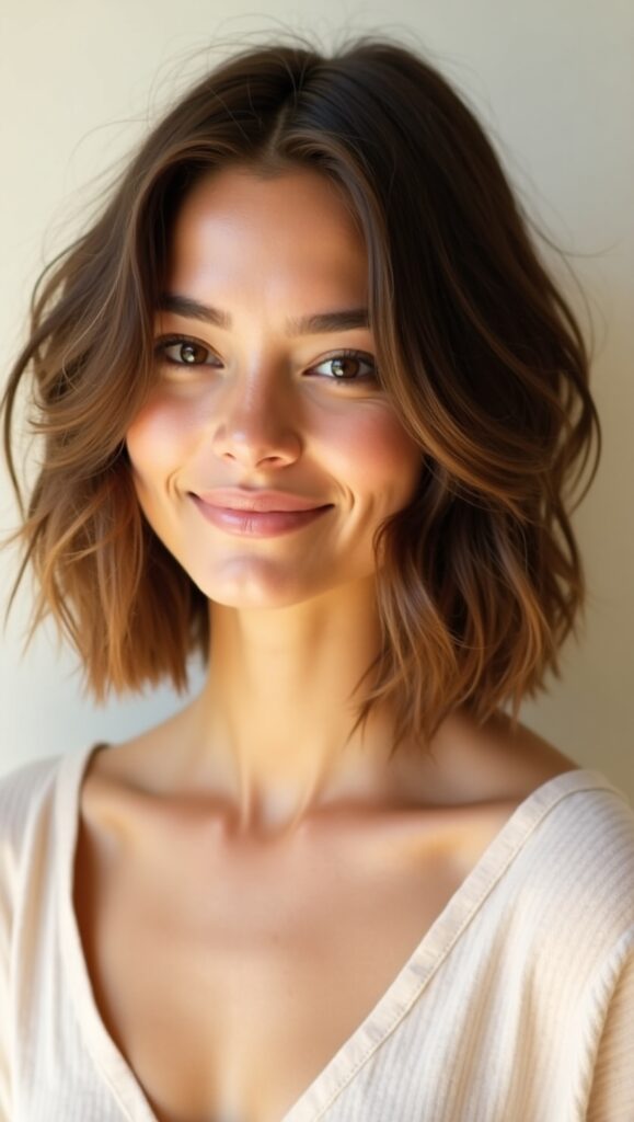 Kurzbeschreibung: Dieser Lob trifft die Schultern mit leichten, abgehackten Enden, die ihm einen strukturierten, geschichteten Look verleihen.
