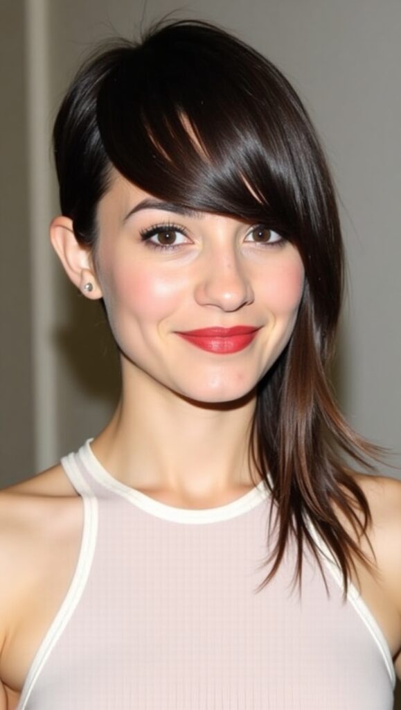 Kurzbeschreibung: Ungleichmäßig geschnittene Pony, die ein kantiges, asymmetrisches Erscheinungsbild erzeugen, perfekt für Frauen, die gerne experimentieren.