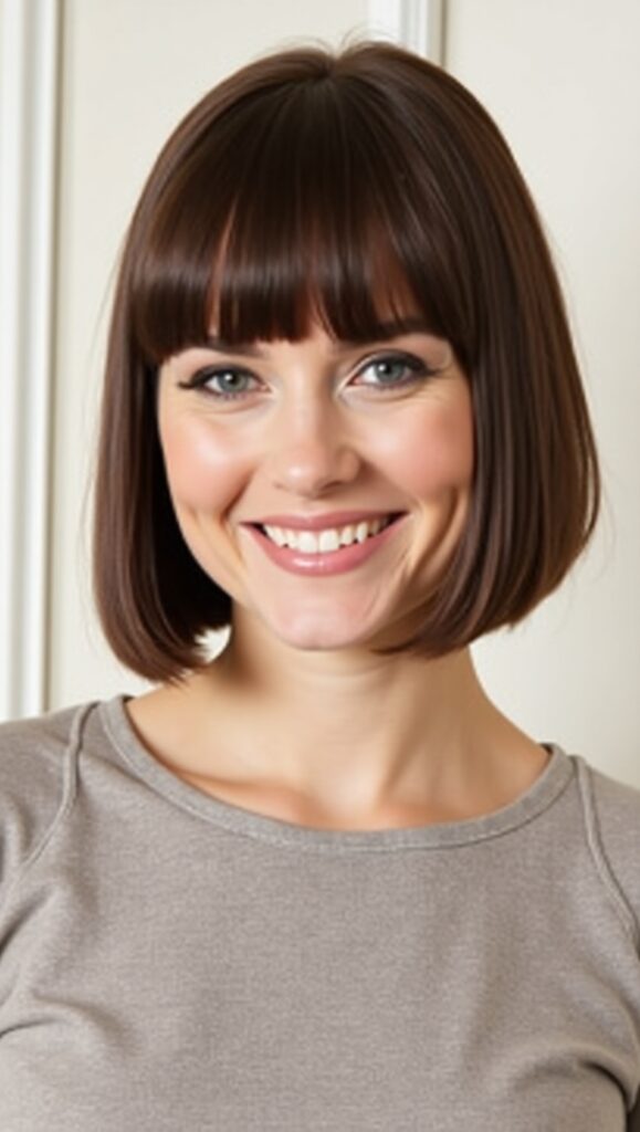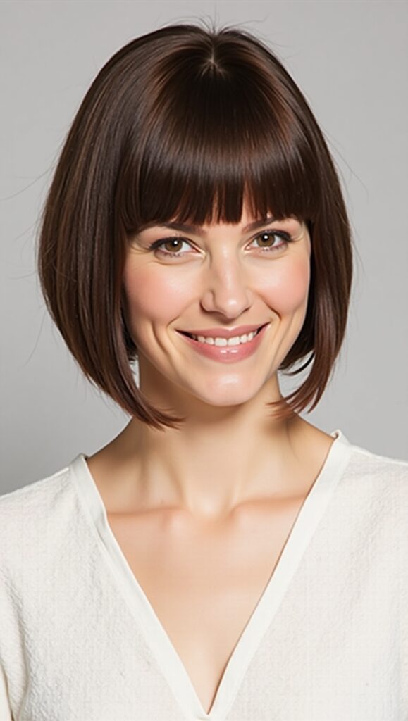 Kurzbeschreibung: Dieser klassische Look ist gleichmäßig über die Stirn geschnitten und ist zeitlos und leicht zu warten.