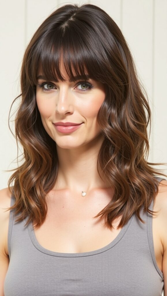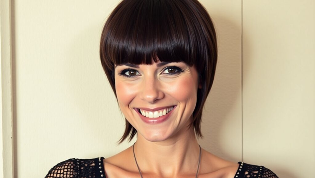 Kurzbeschreibung: Ein voller Fransenstil, der einen größeren Teil der Stirn für einen dramatischen Look abdeckt.