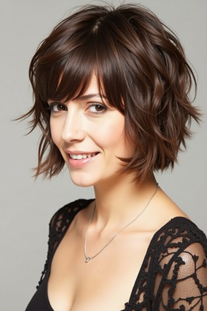 Kurzbeschreibung: Nervös und gezackte, abgehackte Pony bieten einen strukturierten, unordentlichen Look, der Vertrauen und Haltung ausstrahlt.