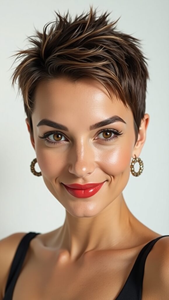 Kurzbeschreibung: Ein kurzer, stacheliger Schnitt, der das Vertrauen mit strukturierten Schichten ausstrahlt.
