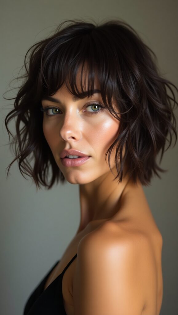 Kurzbeschreibung: Ein stilvoller Bob mit zotteligen Schichten und einem zerzausten Finish.