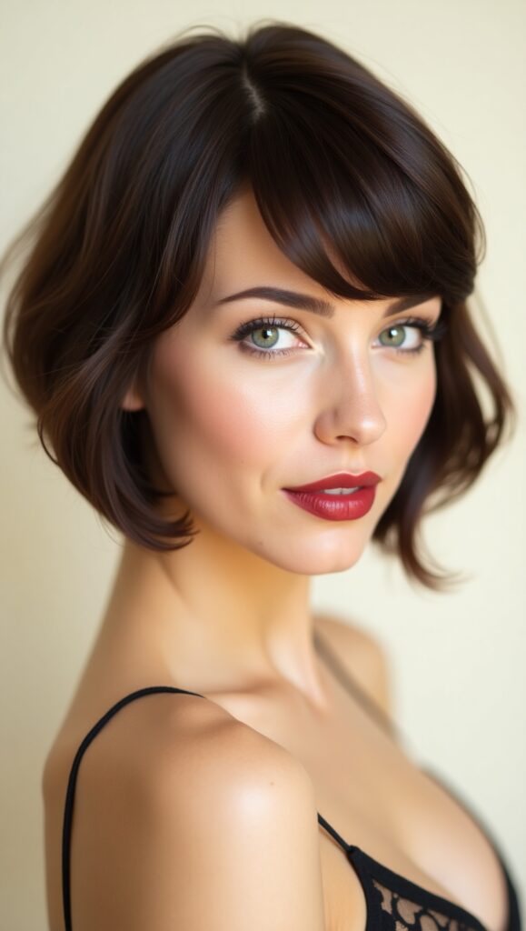 Kurzbeschreibung: Ein schicker, kurzer Kitty -Schnitt gepaart mit stumpfen Pony für ein jugendliches Erscheinungsbild.