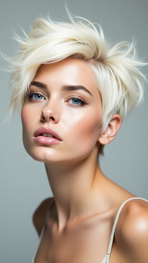 Kurzbeschreibung: Eine platinblonde Version des Kitty Cuts mit scharfen, kantigen Schichten.
