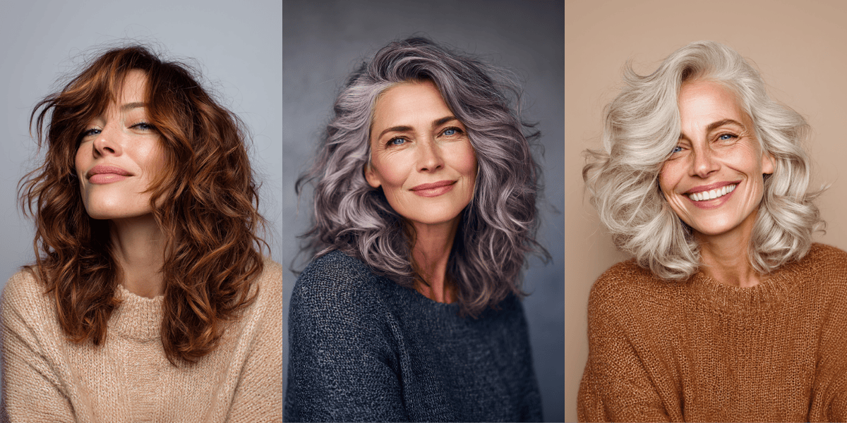 Ein weller welliger Bob mit weichem Kinn, gepaart mit silbergrauen Highlights, die Licht ins Gesicht bringen und die Textur verstärken. Ideal für reife Frauen, die ihre natürlichen Silbersträhnen umarmen.