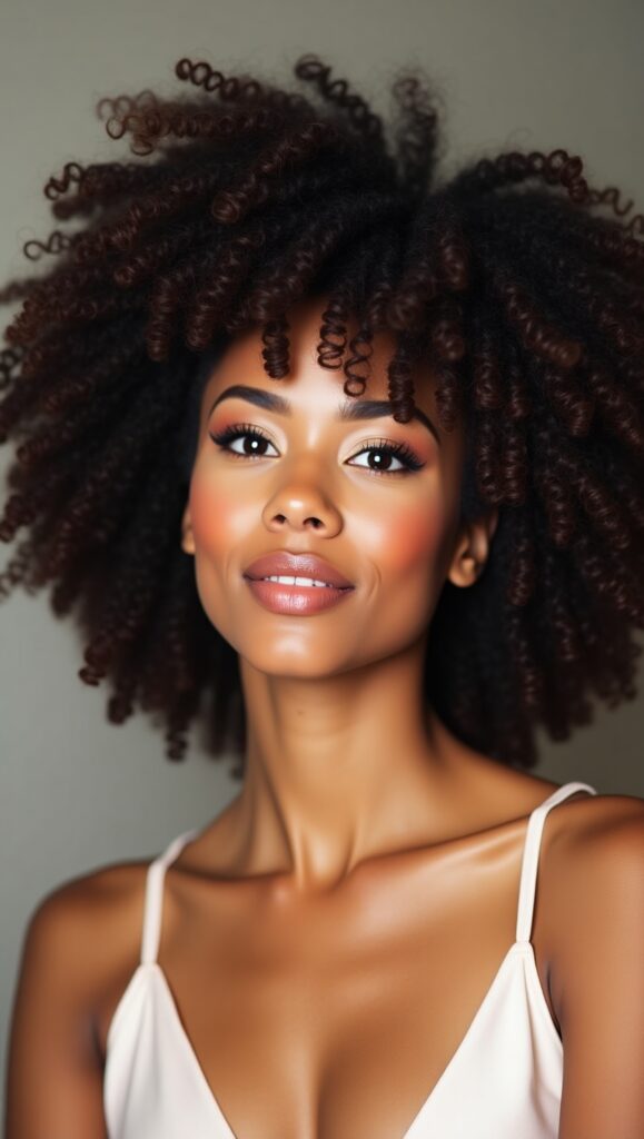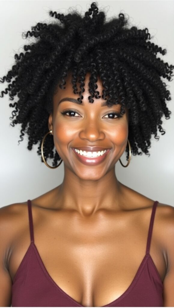 - Beschreibung: Ein vollständiger Afro mit einem Abschnitt von Locken, der als Pony bezeichnet wird und die Stirn für eine weiche, feminine Berührung umrahmt.