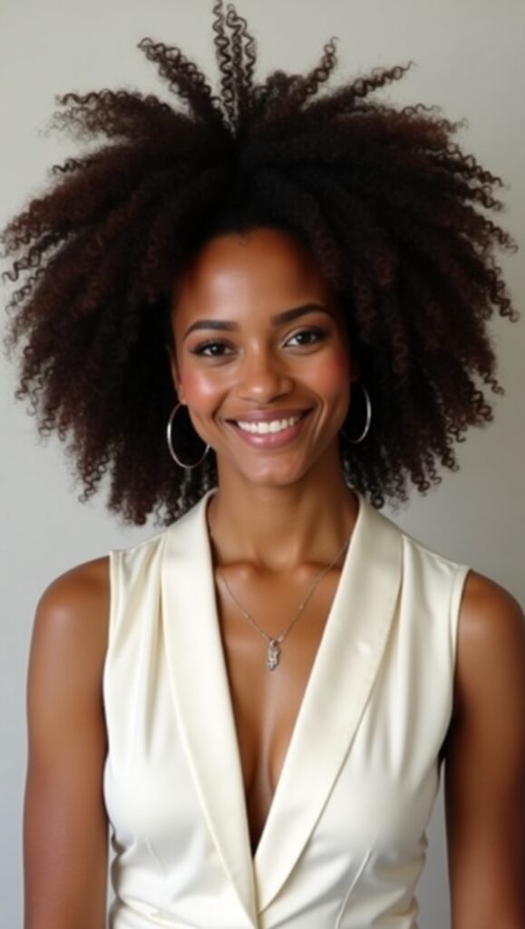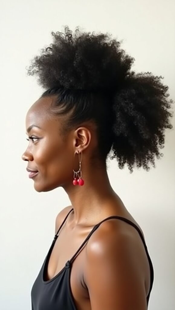 - Beschreibung: Ein hoher, loser Afro -Puff, der an der Krone gebunden ist und einer Ananas ähnelt, wobei Locken auf natürliche Weise kaskadieren.