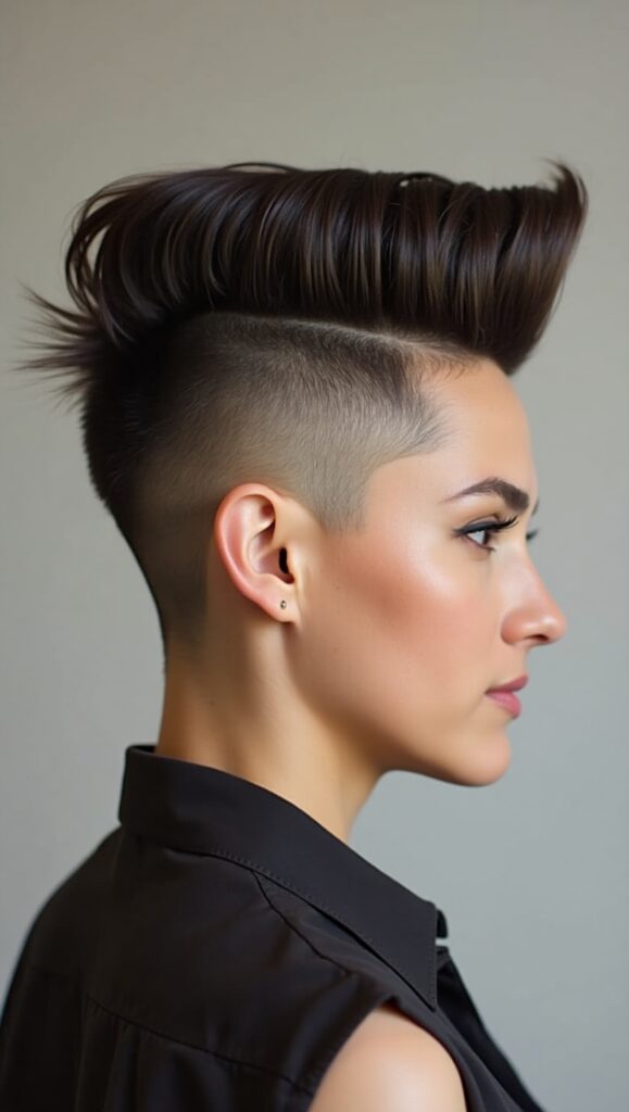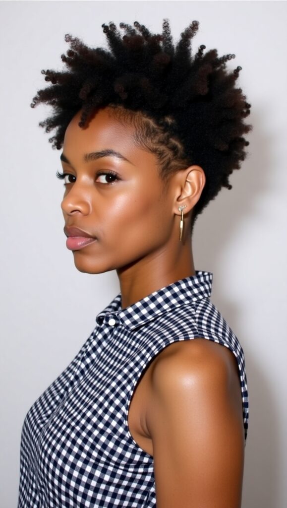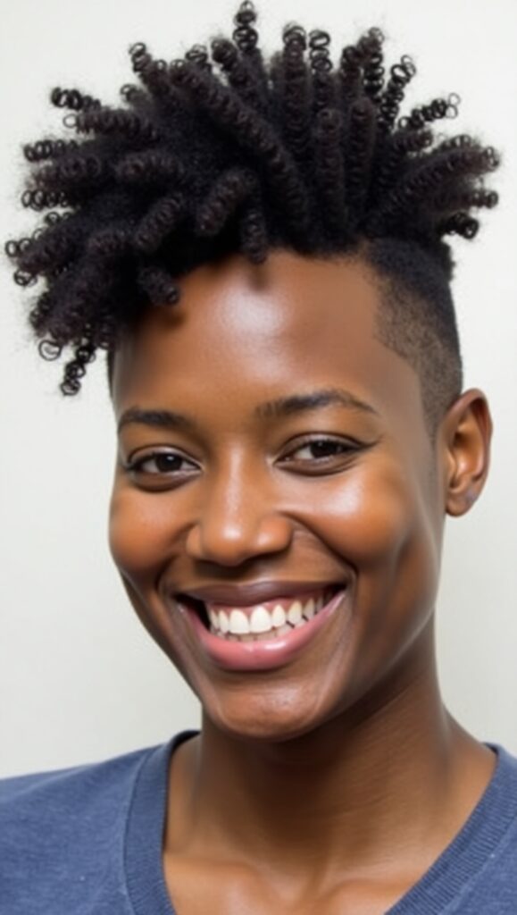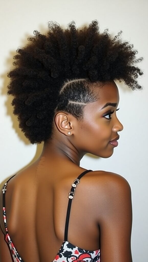 - Beschreibung: Ein von Mohawk inspirierter Afro mit rasierten oder eng beschnittenen Seiten und einem voluminösen Streifen von Locken in der Mitte.