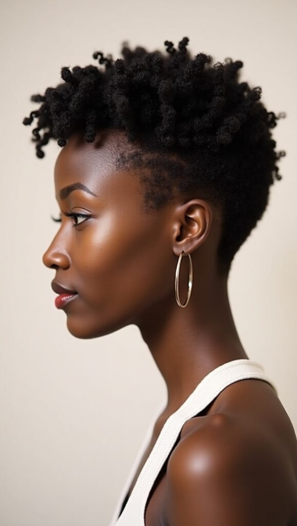 - Beschreibung: Ein kurzes, dicht beschnittenes Afro, das die Kopfhaut umarmt und mit definierten Locken einen ordentlichen und kompakten Look bietet.