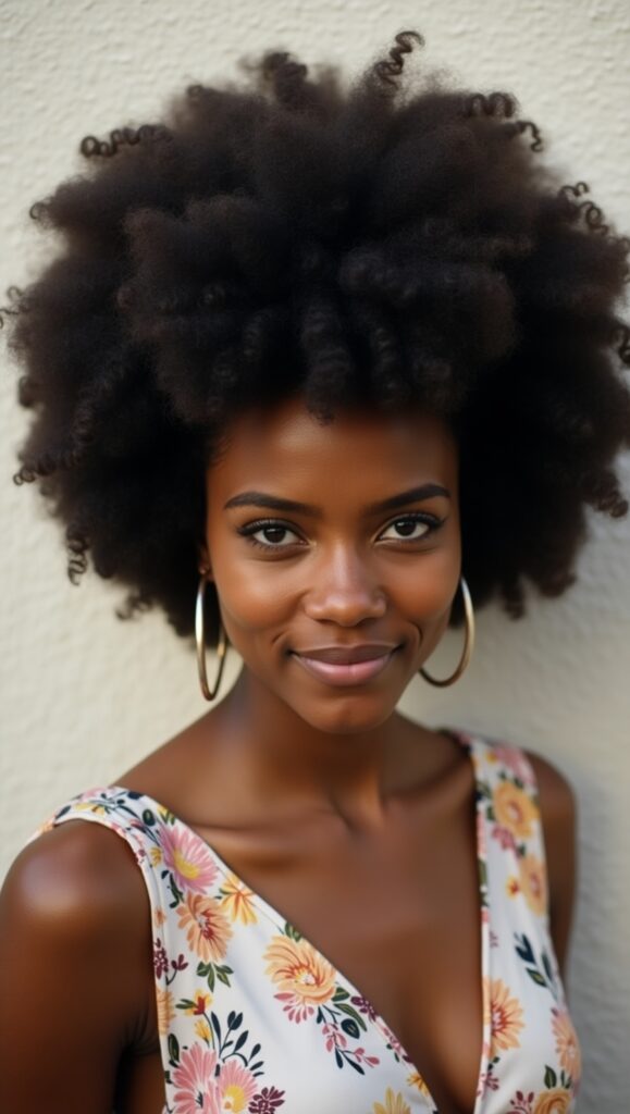 - Beschreibung: Ein vollständiger, abgerundeter Afro, der das natürliche Volumen und die Textur des Haares zeigt. Es ist zeitlos und fett, mit Locken, die fest gewickelt oder locker definiert sind.