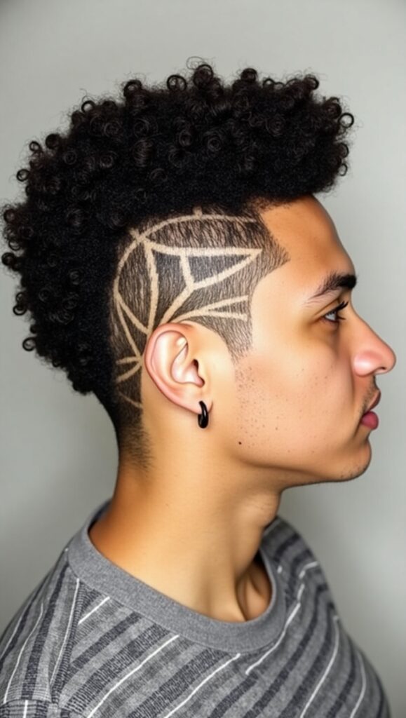 - Beschreibung: Ein Afro in geometrische oder künstlerische Formen, oft mit rasierten Mustern oder sich verjüngenden Kanten.