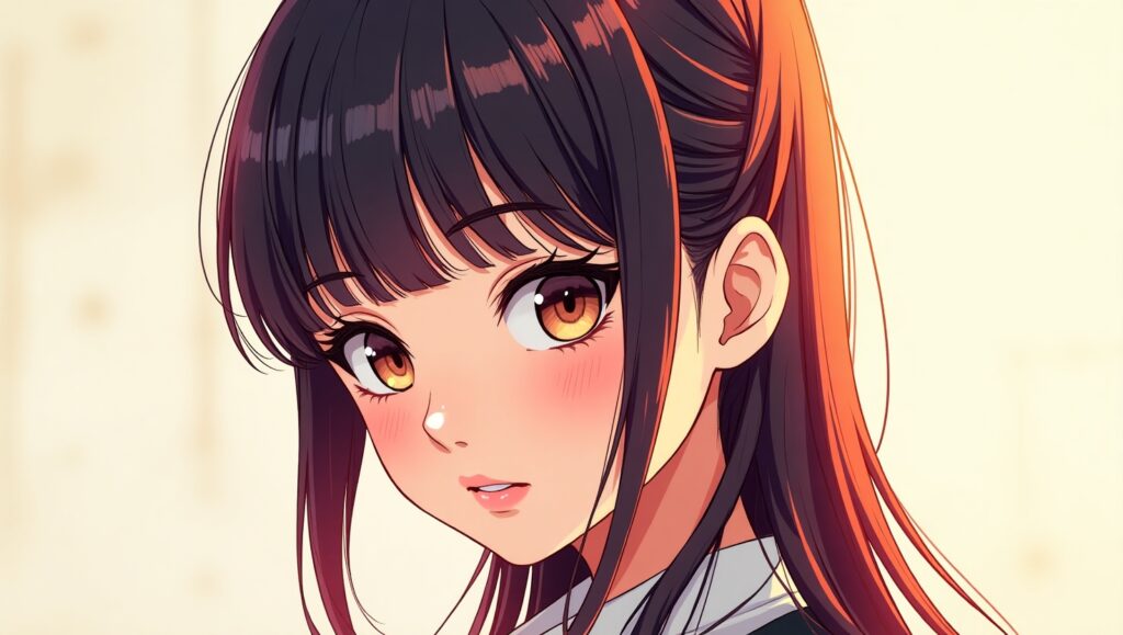 Kanal K-Pop- oder Anime-Vibes mit geradlinigen Pony und langen, wispigen Koteletten. Am besten für feine, gerade Haare. Stil mit einem halben Ponytail für Flair.