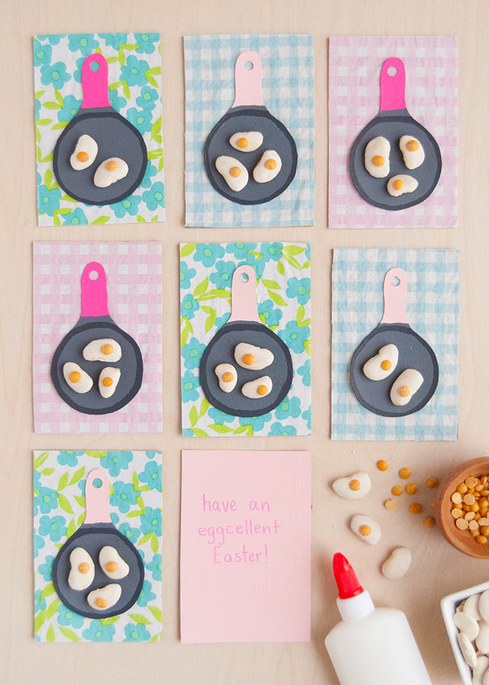Ostern ist normalerweise an der Zeit, farbenfrohdekorierte Eier zu machen, aber wie wäre es mit diesen verspielten gebratenen Eierkarten? Sie sind eine unterhaltsame Art, Ihren Freunden und Ihrer Familie ein adrahmendes Ostern zu wünschen, und können Sie sagen, woraus sie gemacht sind? Getrocknete Limabohnen und gelbe Split -Erbsen! Im Laufe der Jahre habe ich ein paar DIYs mit gebratenem Eier gemacht (diese Brunch-Einladungen und diese sonnigen Ostereier), aber diese Bohnenkunsteier sind definitiv mein Favorit der drei.