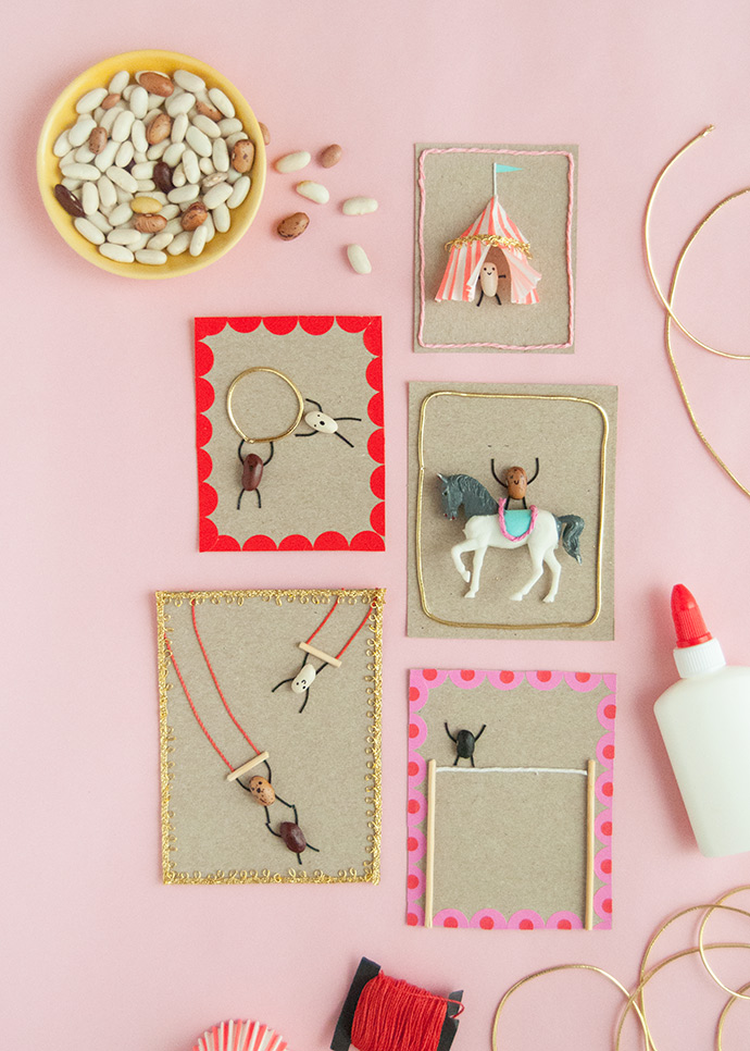 Ordnen Sie die Bohnen an, die ihre Zirkusakte auf den Karten machen. Für das Zirkuszelt habe ich ein Mini -Cupcake -Papier verwendet, das ich halbiert und dann einen Schnipsel an der Seite geschnitten habe, um das Zelt zu öffnen. Kleben Sie die geschnittenen Kanten an den Karton und verwenden Sie dann die verbleibende Hälfte des Cupcake -Papiers, um ein dreieckiges Dach für die Oberseite des Zeltes herzustellen. Dies kann ein wenig schwierig sein, um sich gut auszurichten, also habe ich eine goldene Schnur entlang der Naht hinzugefügt und es versteckte alle Unvollkommenheiten gut. Die anderen abgebildeten Zirkusakte sind ziemlich selbsterklärend: Verwenden Sie ein Spielzeugpferd und kleben Sie einen Papiersattel an, um etwas Farbe hinzuzufügen, einen Bohnenspaziergang auf einem Drahtgitter zu machen, Trapezes für die Bohnen zu schwingen und einen einfachen Reifen mit Goldschnur zu machen.