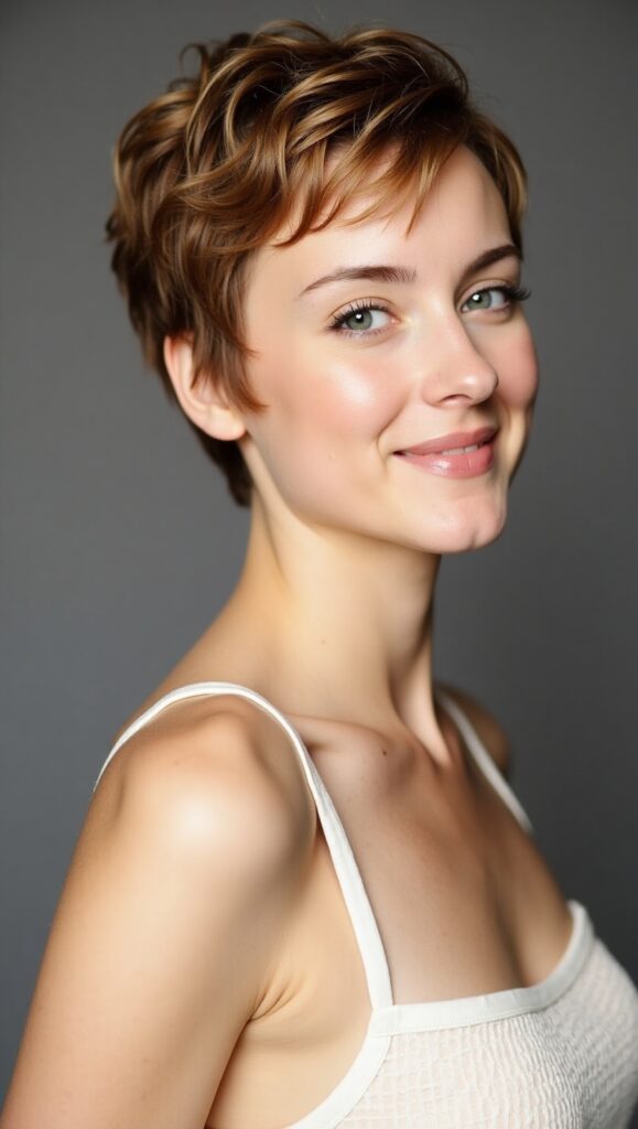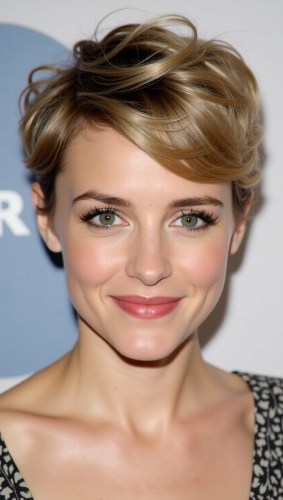 - Beschreibung: Zarte, zerzauste Wellen auf kurzem Haar, die eine spielerische, spriteähnliche Atmosphäre verleihen. Die Wellen sind subtil und verleihen den geschnittenen Schnitten jedoch Dimension.