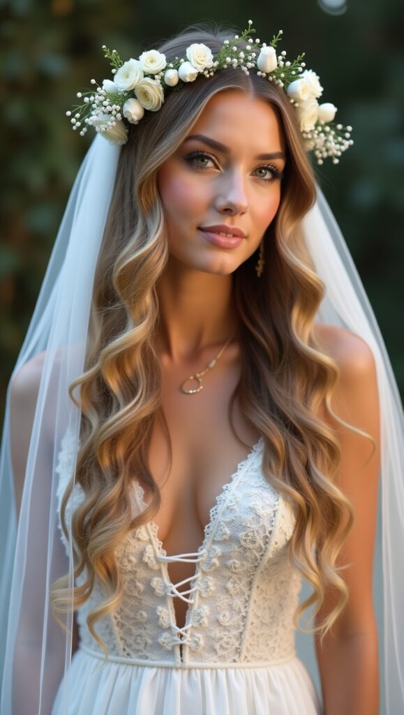 - Beschreibung: Weiche Wellen, die mit einer geflochtenen Krone oder einem Halo gestaltet sind und einen königlichen, von Wald inspirierten Look erzeugen. Die Wellen fließen frei unter die Krone.