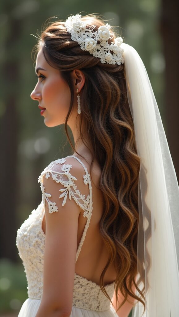 - Beschreibung: Wellen, die mit Kristall- oder Perlenhaarzubehör geschmückt sind und dem weichen, fließenden Stil eine funkelnde, magische Note verleihen.
