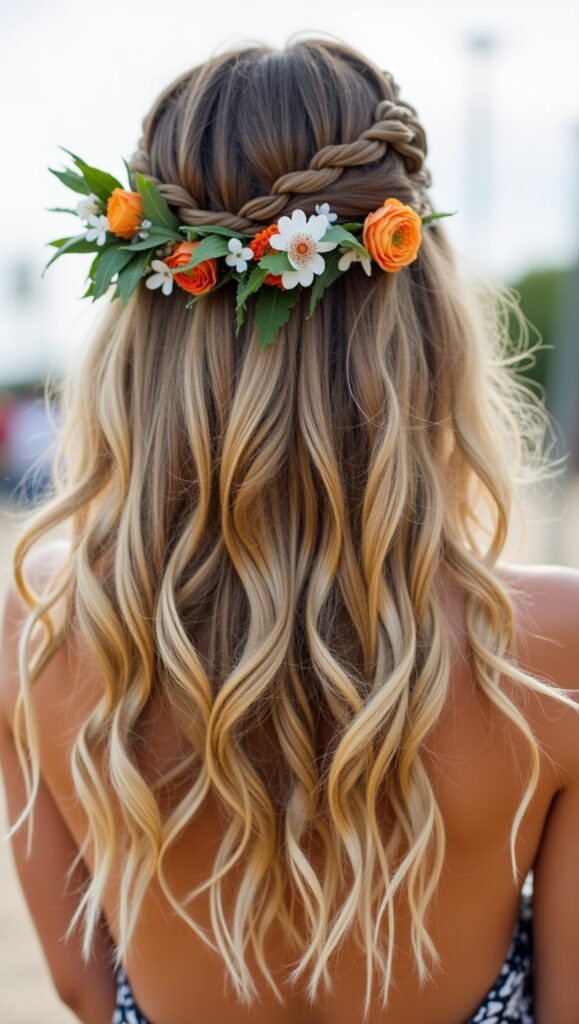 - Beschreibung: Lose, unbeschwerte Wellen mit einem leicht rückgängigen Look, oft geschmückt mit Zöpfen oder Blumenzubehör für einen Festivalstil.
