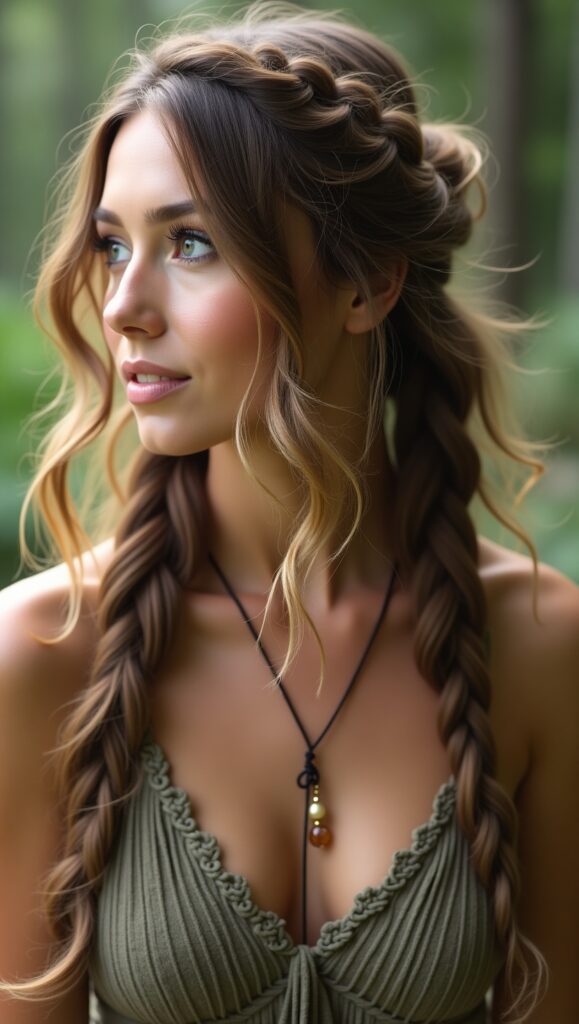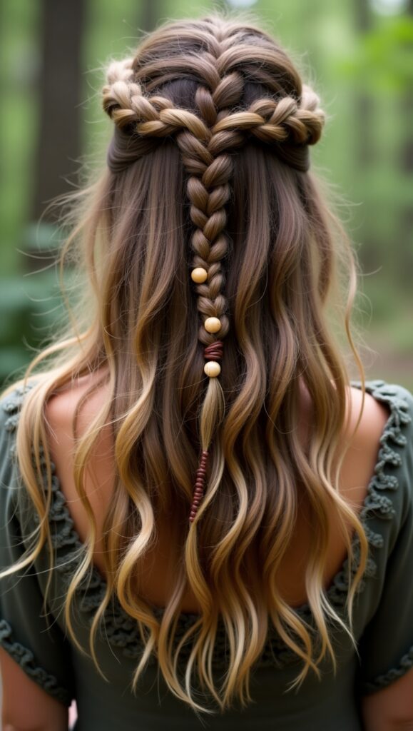- Beschreibung: Rustikale, leicht betrogene Wellen mit erdigen Accessoires wie Lederschnüren oder Holzperlen, die an eine ästhetische Waldsprite erinnern.