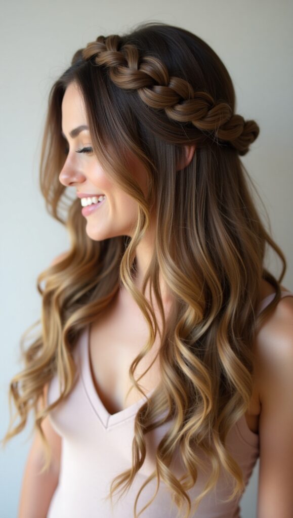 - Styling -Tipps: Erstellen Sie ein lockeres niederländisches Geflecht um die Krone und kräuseln Sie dann das verbleibende Haar. Verwenden Sie ein flexibles Hold -Spray, um das Geflecht ohne Steifheit an Ort und Stelle zu halten.