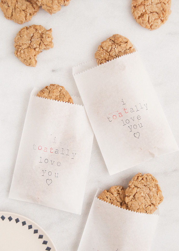 Sie können diesen Ausdruck in Kombination mit Haferkeksen auf eine Menge von Arten verwenden! Anstatt einzelne Cookies auszugeben, können Sie eine ganze Stapel in eine Schachtel für Ihren Valentinstag legen und stattdessen die Nachricht auf einen Geschenketikett schreiben. Oder wenn Sie rechtzeitig wenig laufen, verwenden Sie im Laden gekaufte Haferflocken und fügen Sie einen Tag an diese zu!