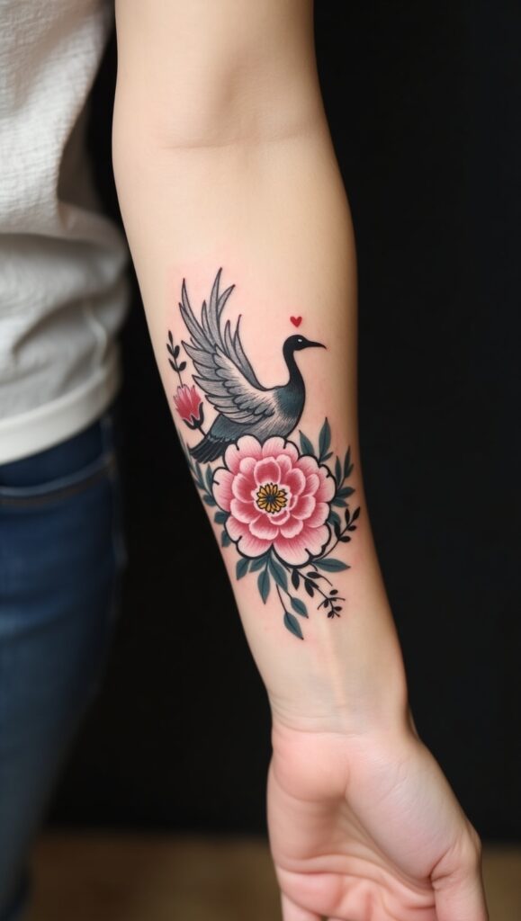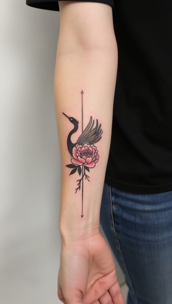 15. Unterarm: kleiner Kran mit Peonies Tattoo