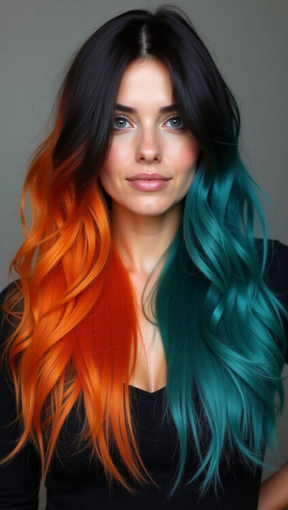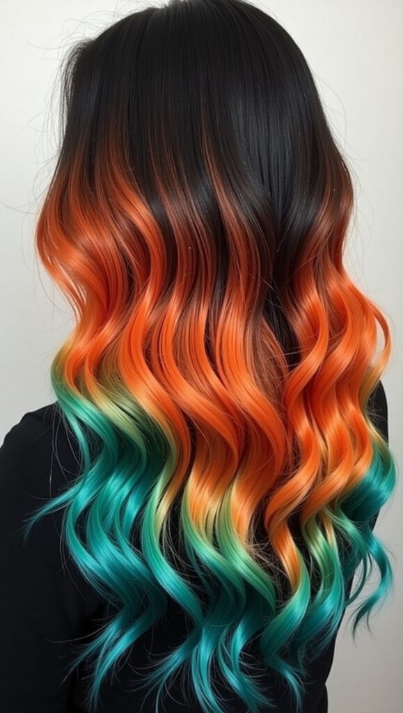 - Details: Schwarz bis feurig orange oder blaugrün Ombre.