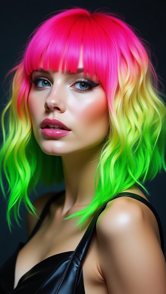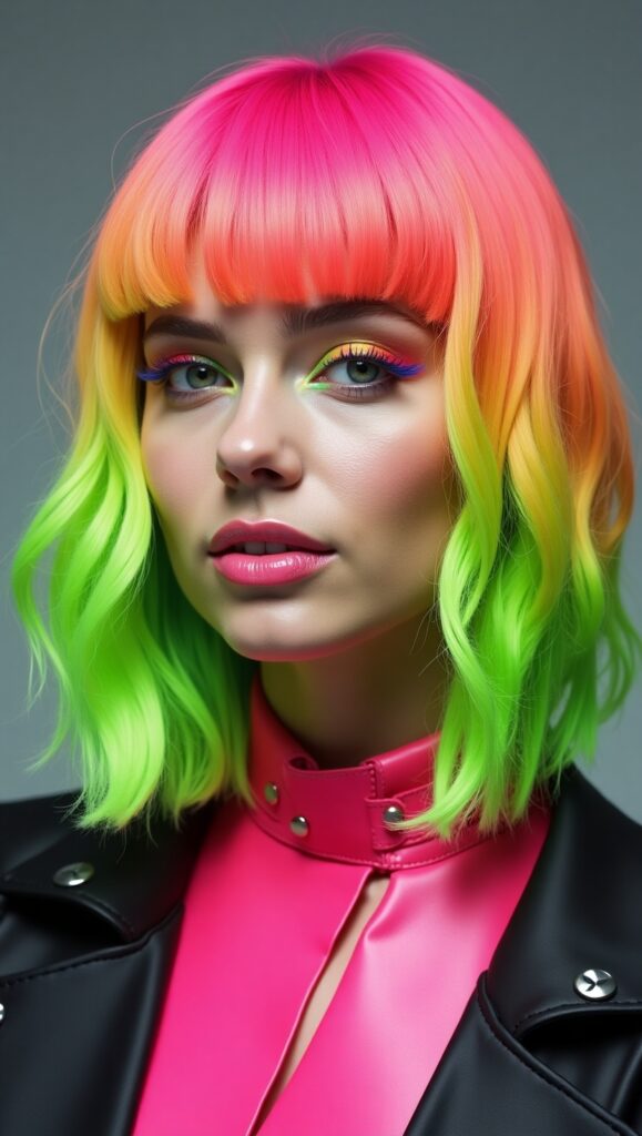 - Beschreibung: Lebendiges Neonrosa oder grünes Oberteil mit passenden oder kontrastierenden langen Schichten.