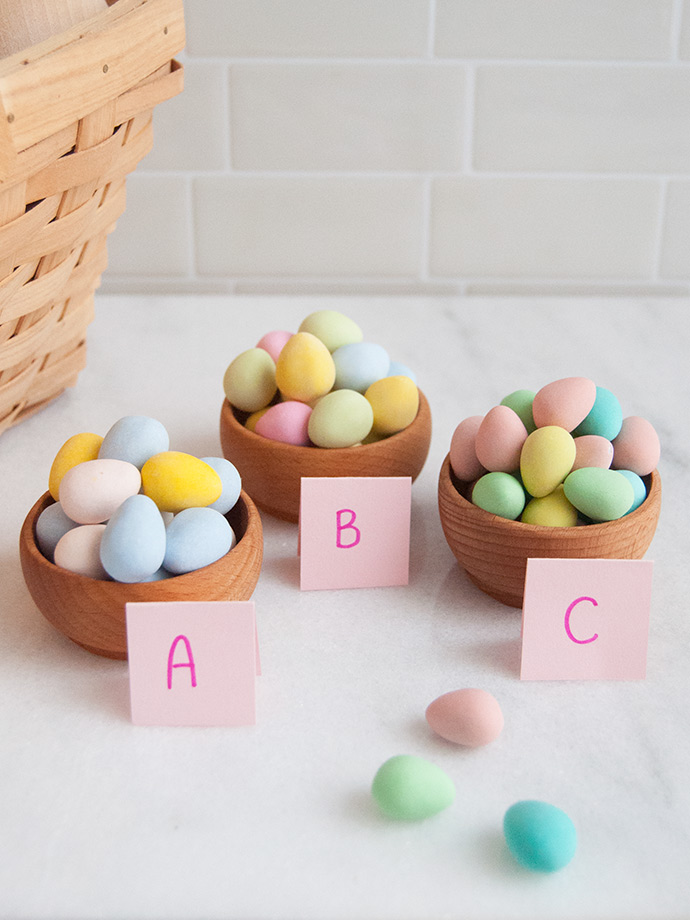 Eine Sache, die Sie bei der Erstellung Ihres Blind -Geschmackstests beachten sollten, ist, wie unterschiedlich die Süßigkeiten aussehen. In diesem Fall sind die Eier ziemlich ähnlich, aber die Größen und Farben variieren. Wenn Sie diesen Geschmackstest mit Erwachsenen oder Teenagern durchführen, sind sie möglicherweise mit dem Aussehen der verschiedenen Eier vertraut, insbesondere wenn sie eine Lieblingsmarke in den Geschmackstest haben. Wenn Sie dies mit Kindern tun oder nicht glauben, dass Ihre Teilnehmer die Marken nach Auge erkennen können, können Sie die Stationen wie gezeigt einstellen: in einer Schüssel oder einem Teller, die jeweils mit einem Buchstaben gekennzeichnet sind. Die Person, die diese Schalen einrichtet und kennzeichnet, weiß, welches dies ist, was daher nicht genau auf die gleiche Weise am Test teilnehmen kann.